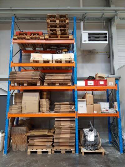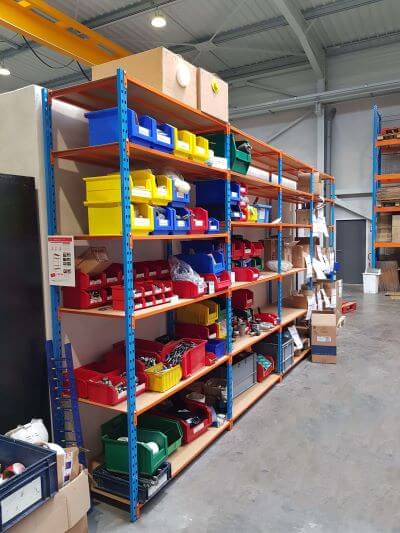 Les étagères métalliques ProfilTUB permettent de stocker des petites pièces, bacs et cartons jusqu’à 250 kg par niveau.