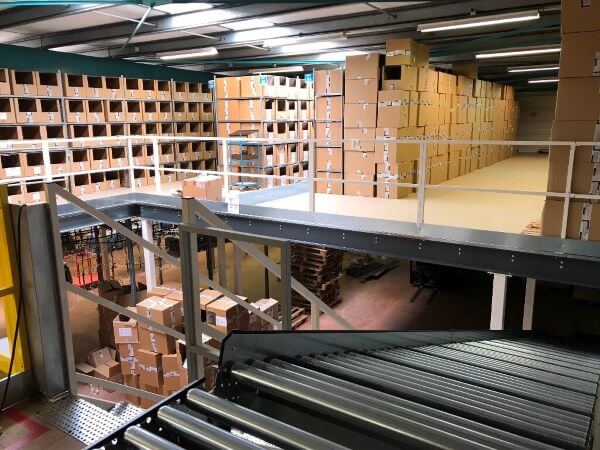 La spécificité de l’installation : la mezzanine de stockage est installée au-dessus d’un système de convoyeur.
