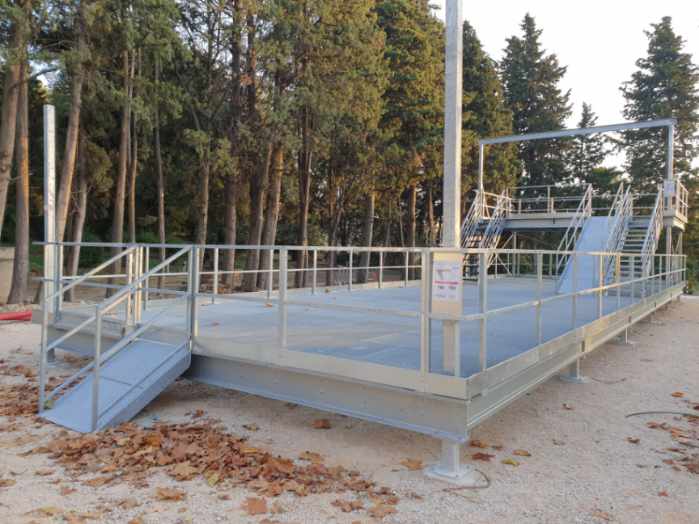 Escaliers, rambardes, rampe d’accès et portique pour installer des caméras.
