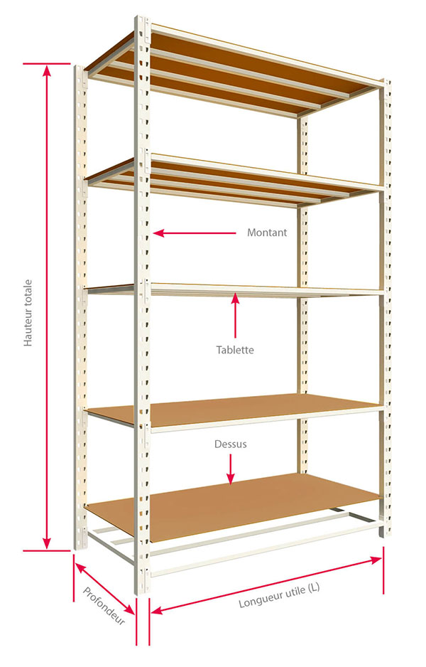 • Le rayonnage à tablettes peut être adapté en hauteur, en longueur, et en profondeur selon ses besoins.