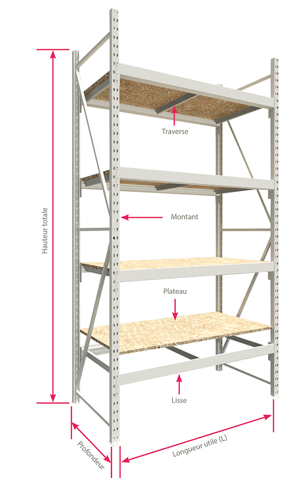 Le rayonnage mi-lourd est constitué d’échelles avec 2 montants profilés 12 plis, épaisseur 15/10ème perforés tous les 50 mm et reliés entre eux par des traverses et diagonales boulonnées.